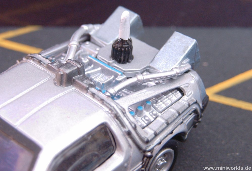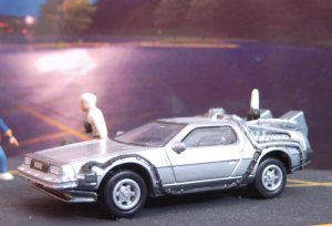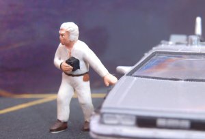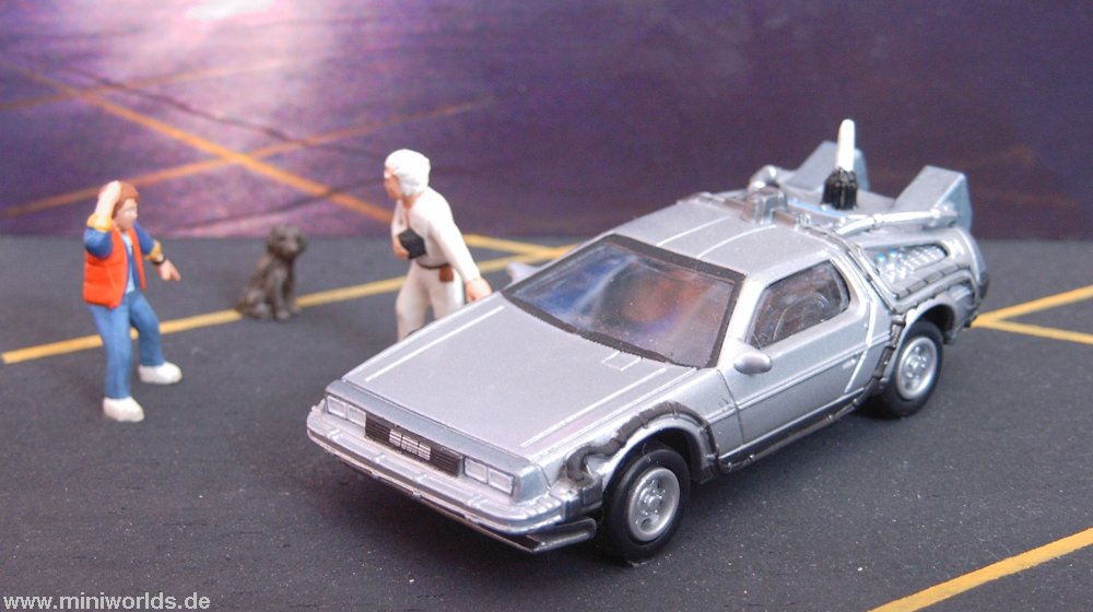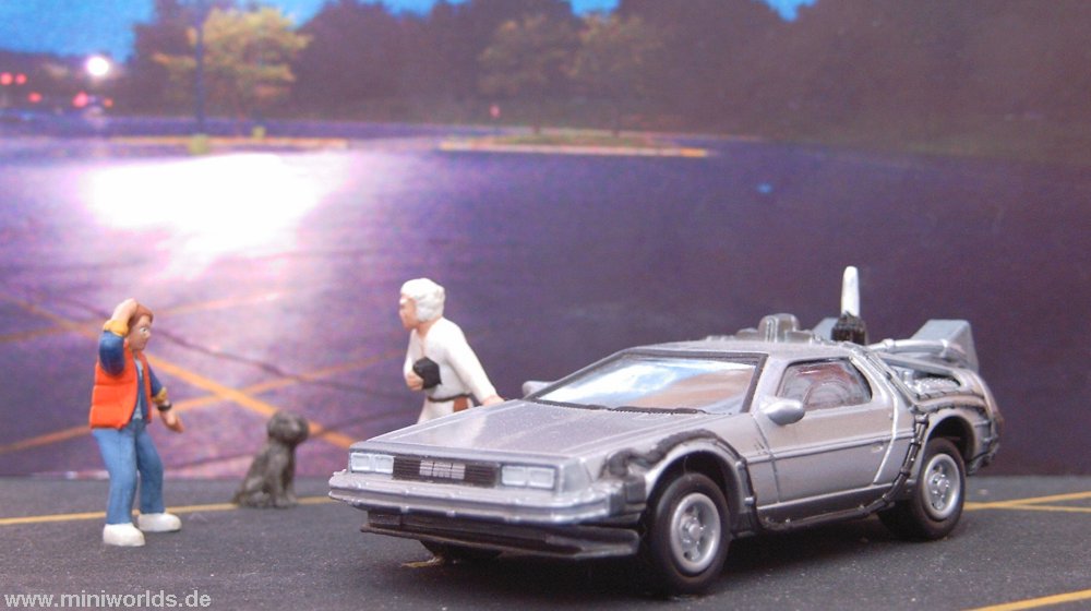 Dieses kleine Diorama, welches auf einer Grundfläche von gerade einmal 15 x 10 cm entstand, stellt die Szene aus den ersten Teil der bekannten „Zurück in die Zukunft“ Reihe dar, in der Marty zum ersten mal die Zeitmaschine gezeigt bekommt. Das Fahrzeug stammt ebenso wie die |