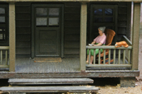 hat sich im Schaukelstuhl niedergelassen und liest ein