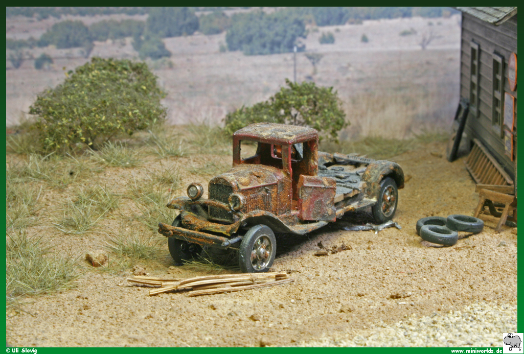 Holzplatte von ca. 30 x 40 cm entstand das Diorama rund um Speedy